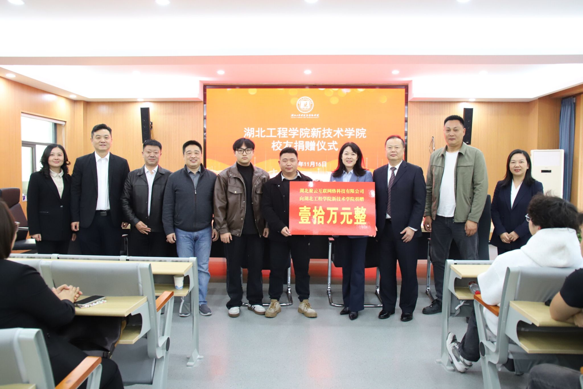 捐赠仪式上,学校与丁建喜总经理签订捐赠协议,湖北聚云互联网络科技有限公司向湖北工程学院新技术学院捐赠人民币壹拾万元整,以支持学院各项事业的建设与发展。院长张辉代表学校向丁建喜校友颁发捐赠证书。党委书记欧阳莎莉代表学校接受捐赠。